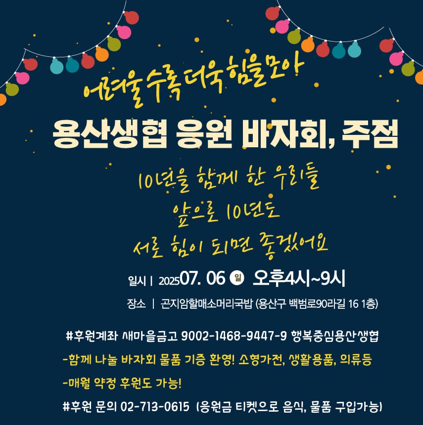 이런 어려움 속에서도 용산생협은 조합원, 지역주민들과 함께 생협을 지켜내기 위해 지난해에 이어 다시 한 번, 후원의 밤을 열고자 합니다.
